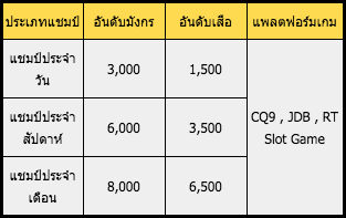 ①.แชมป์รายวัน: ในวันนั้น (ระหว่าง 00:00 น. ถึง 23:59 น.) ผู้ที่ชนะในจำนวนเงินกำไรจากการเดิมพันสูงสุดหรือผลกำไรทวีคูณจะเป็นแชมป์ของรายการมังกรหรือเสือ