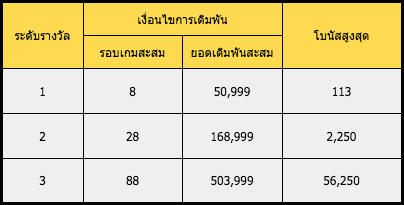 ⑷.ในแต่ละช่วงเวลาของกิจกรรมรางวัลของแต่ละระดับสามารถทำได้ไม่เกินครั้งเดียวและในช่วงโปรโมชั่นที่สองสามารถรับรางวัลได้สูงสุด 6 ครั้ง
